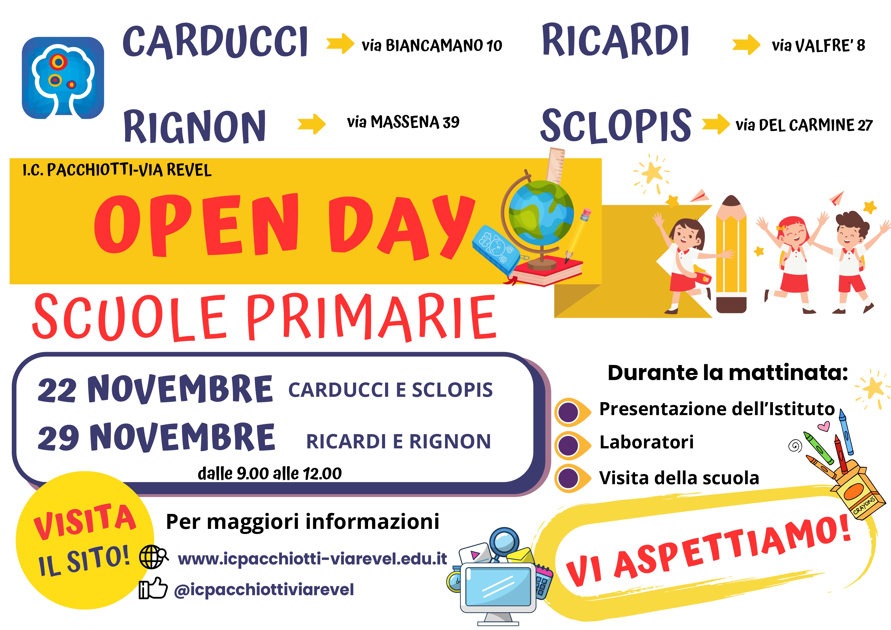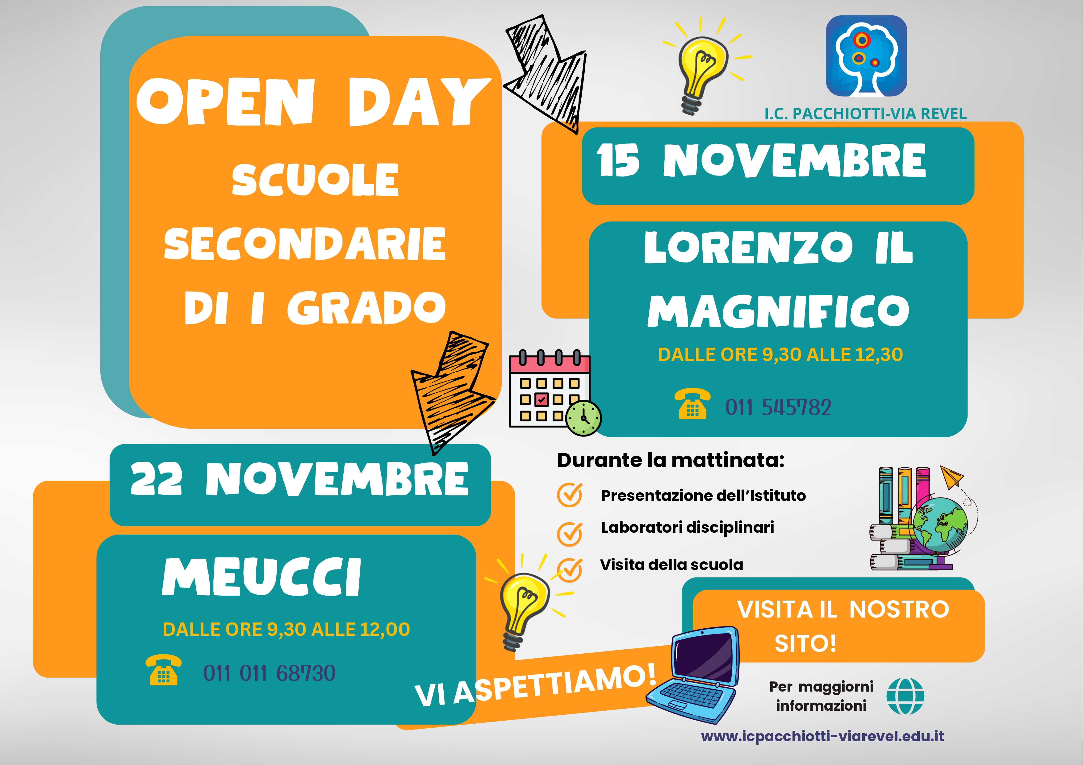 Cos'è Open Day per tutti gli ordini di scuola Documenti Open day Infanzia Open day Primaria Open day Secondaria Servizio Famiglie e studenti Pre e post scuola Calendario scolastico A.S. 2025/2026 Laboratori extrascolastici 2025/2026 Proposta di laboratori extracurriculari per la scuola primaria e secondaria Biblioteca Orientamento Per l'iscrizione alla Scuola Secondaria di II° Percorsi di studio Scuola dell'Infanzia Scuola Primaria Scuola Secondaria di primo grado Indirizzo Musicale Dall'AS 2023/2024 il nostro istituito offre la possibilità di accedere alla sezione ad indirizzo musicale. Struttura organizzativa Scuola/Istituto Istituto Comprensivo "Pacchiotti - Via Revel" di Torino TOIC8B500Q Scuola dell'Infanzia Scuola Primaria Scuola Secondaria di I° Luogo Edificio scolastico Scuola dell'Infanzia Via Santa Chiara Via Santa Chiara, 12 - 10122 Torino Scuola dell'Infanzia Corso Matteotti Palazzo dell'Arsenale, Corso Giacomo Matteotti, 6, 10121 Torino TO Scuola Primaria "Sclopis" Via Del Carmine, 27 - 10122 Torino Scuola Primaria "Ricardi Di Netro" Via Beato Sebastiano Valfrè, 8 - 10121 Torino Scuola Primaria "Carducci" Via Umberto Biancamano, 10, 10121 Torino TO Scuola Primaria "Rignon" Via Massena, 39, 10128 Torino TO Scuola Secondaria di I° Meucci Via Revel Via Ottavio Revel, 8 - 10121 Torino Scuola secondaria di I grado Lorenzo IL Magnifico Corso Matteotti 9